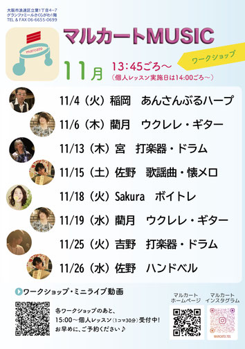 レッスンの日は13:45〜14:15ごろの約30分、利用者のみなさんと一緒に奏でたり歌ったり✨ ライブの日は13:45〜14:25ごろの約40分です! お気軽にご参加ください。
